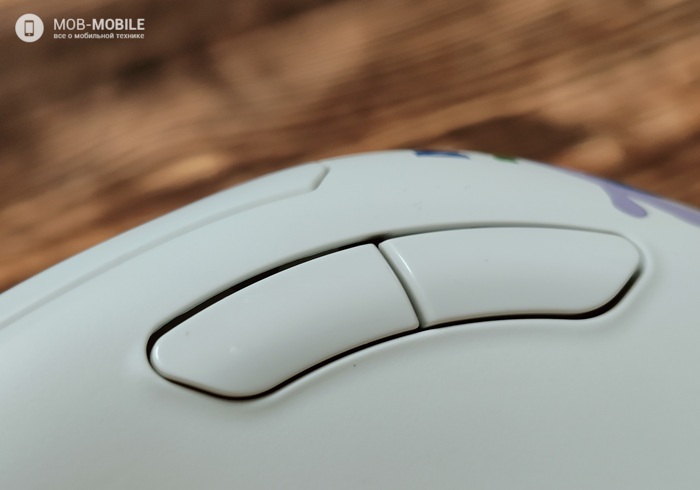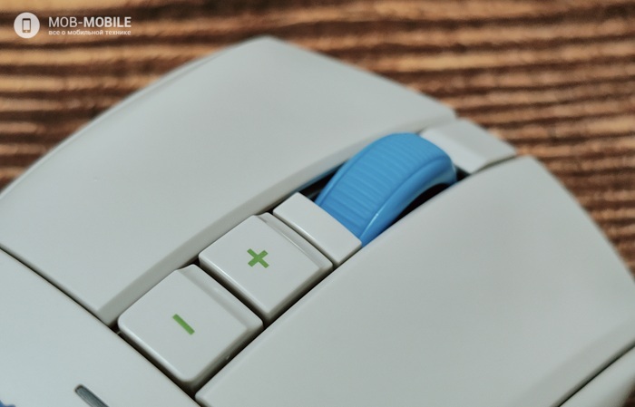 Основные кнопки располагаются отдельно от корпуса и расположены так, чтобы пользоваться скролом было комфортно. За колесиком прокрутки имеются две кнопки, предназначенные для изменения значения CPI. За ними располагается небольшой светодиодный индикатор, отображающий один из шести уровней CPI или во время зарядки – уровень заряда аккумулятора.