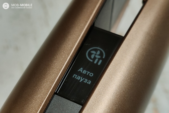 При открывании ручки поток воздуха автоматически замедляется, переводя устройство в неактивный режим. Если фен оставить на три секунды, не касаясь рукой, включится режим автопаузы, при котором двигатель отключится.