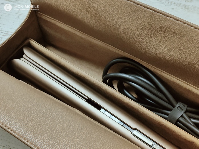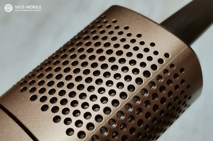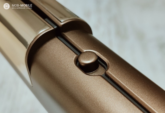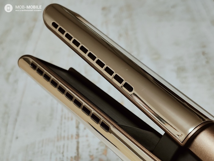 Ручка фена выполнена из пластика золотистого цвета и разделена на два сегмента. В противоположной от места удержания части имеются вырезы, в которых закреплены металлические выпрямляющие пластины.