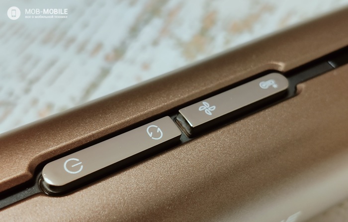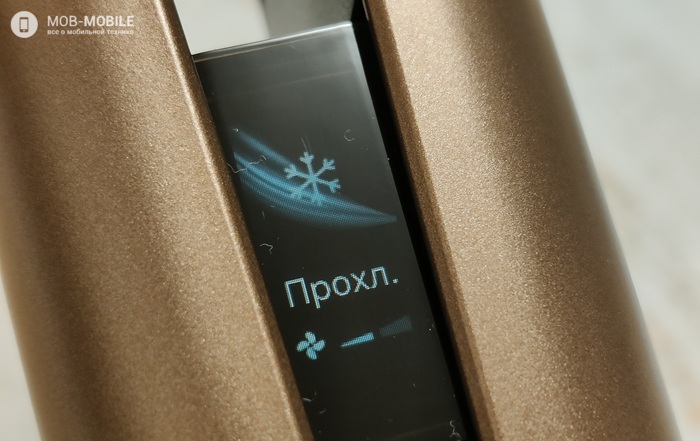 С верхней имеется ЖК-дисплей и пара сдвоенных кнопок-качалок: питание/выбор режима и настройка скорости потока воздуха/настройка температуры.