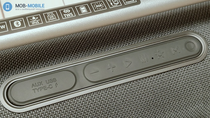 Модель рассчитана в основном на беспроводное подключение, для которого используется вполне современная версия интерфейса Bluetooth 5.4. Она характеризуется обширным радиусом действия соединения (более 10 м), устойчивостью к помехам и низким временем задержки сигнала.Состоящая из четырех динамиков и двух пассивных излучателей акустическая система колонки способна выдавать мощность до 80 Вт. Этого более чем достаточно для озвучивания вечерники в обширном помещении или даже на свежем воздухе.
