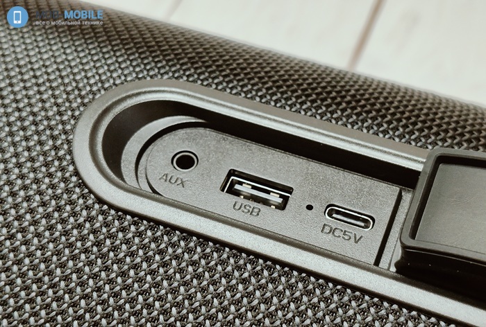 В верхней части находится интерфейс и элементы управления. Под резиновой заглушкой находится разъем AUX, порт USB-A для подключения флешки и разъем USB-C для зарядного устройства.
