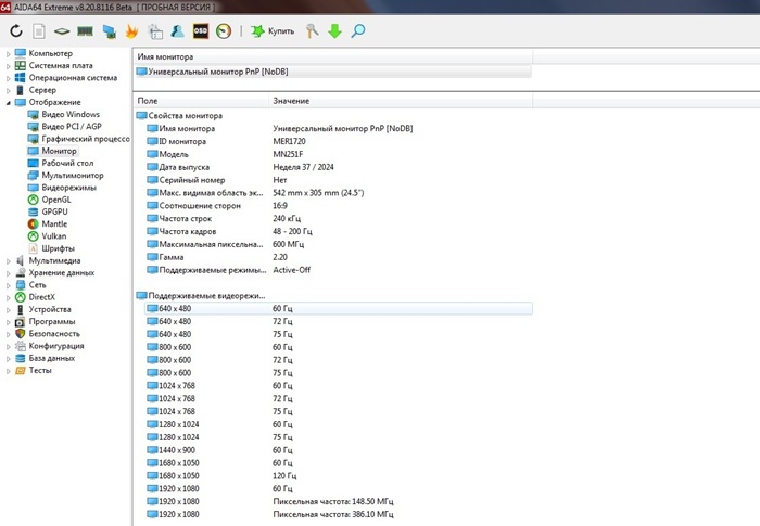 | Разрешение и диагональ экрана | 1920х1080, 16:9, 24.5" (62.2 см) |