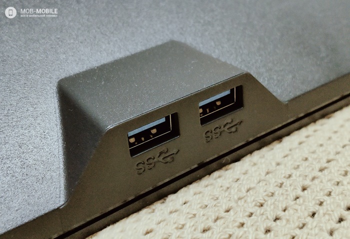 Задняя панель содержит две трапециевидные выпуклости. На левой имеется выключатель питания и логотип бренда, на правой – два выведенных на боковую панель разъема USB 3.0.