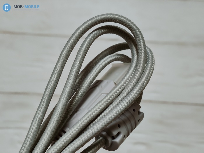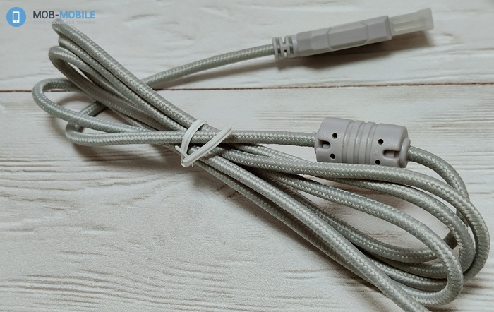 Кабель имеет внушительную длину 2 м. Для предотвращения изломов он покрыт оплеткой из нейлона, поэтому немного жестковат. На нем имеется USB вилка, ферритовое кольцо для нейтрализации ВЧ помех, пульт управления и протектор в месте отхождения от чашки.