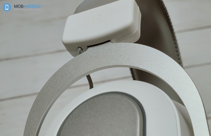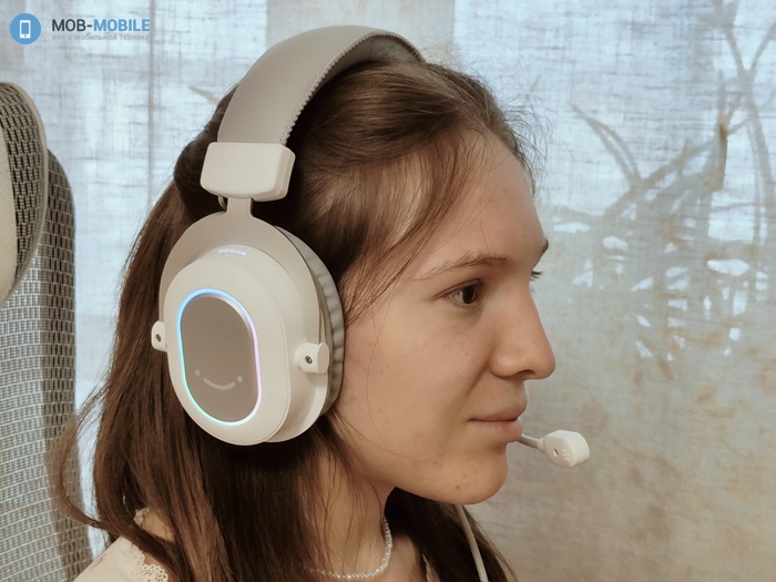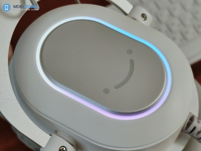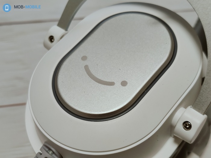Внешняя часть чашек изготовлена из пластика с софт-тач покрытием. На ней имеется RGB подсветка, фирменный смайлик бренда и маркировка правой/левой чашки, расположенная в месте отхождения вильчатого подвеса от оголовья.